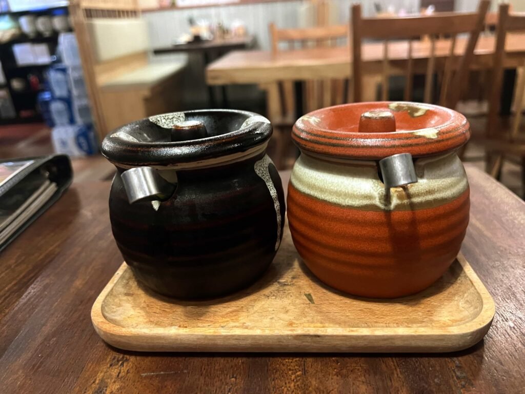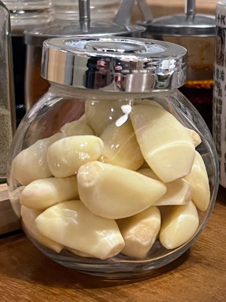 As a garlicoholic, it’s worth mentioning this jar of fresh peeled garlic cloves that’s on every table. There’s a garlic press right next to them too, and you can crush the garlic directly into your ramen.