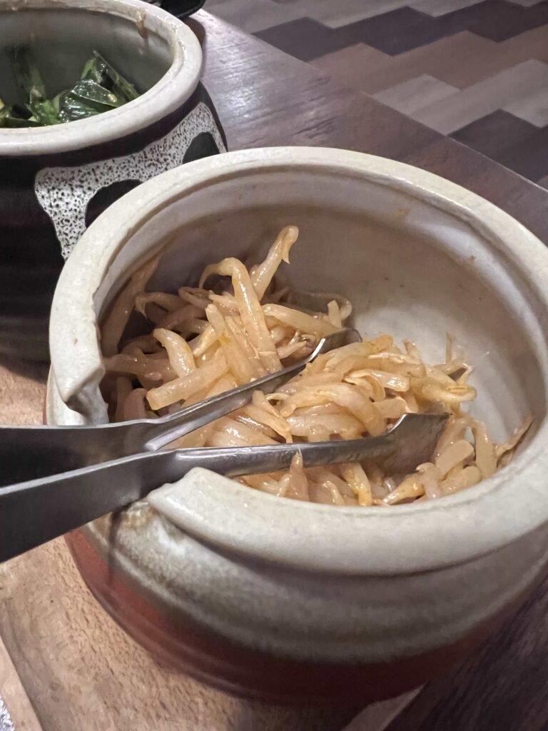 Main ingredients: blanched mung bean sprouts tossed with sesame oil, soy sauce, chili oil, and garlic.